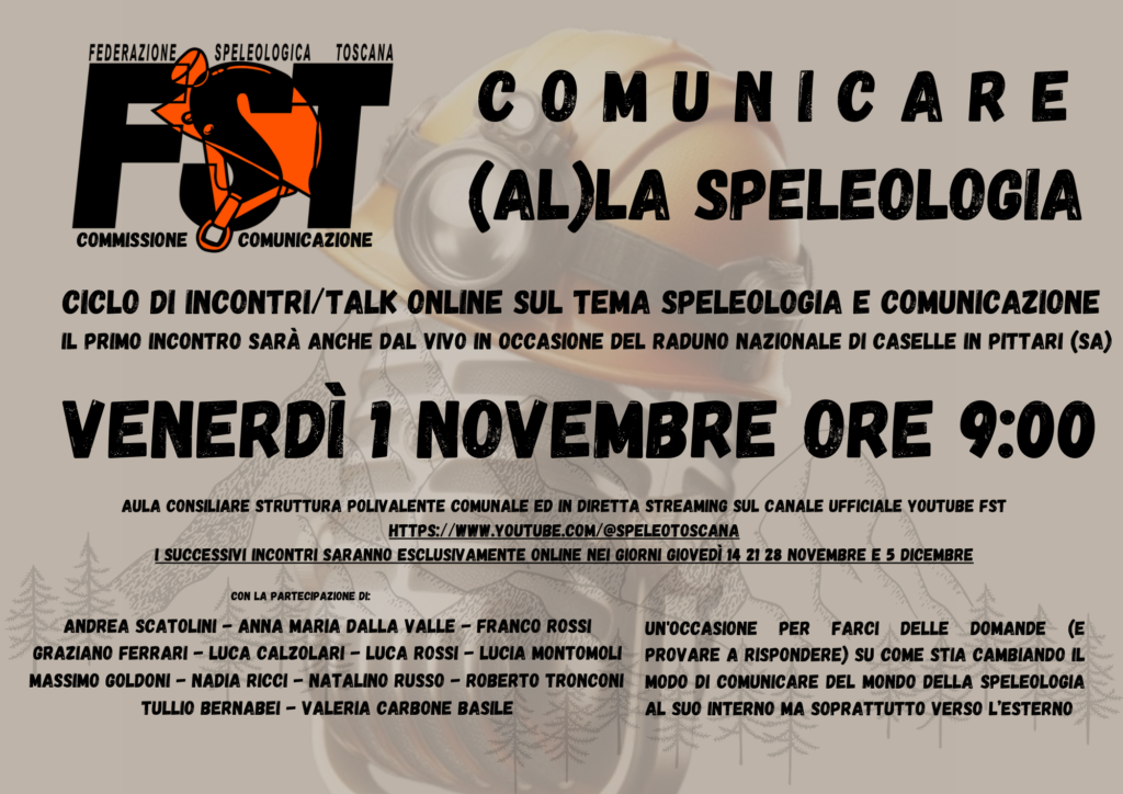 La Commissione Comunicazione della Federazione Speleologica Toscana annuncia un ciclo di incontri dal titolo “Comunicare (al)la speleologia“, una serie di talk/dibattiti online dedicati al tema della comunicazione nel mondo della speleologia. Gli incontri saranno l’occasione per provare a capire come questo settore stia, sempre più velocemente, cambiando il modo di comunicare della speleologia sia al suo interno che verso l’esterno.